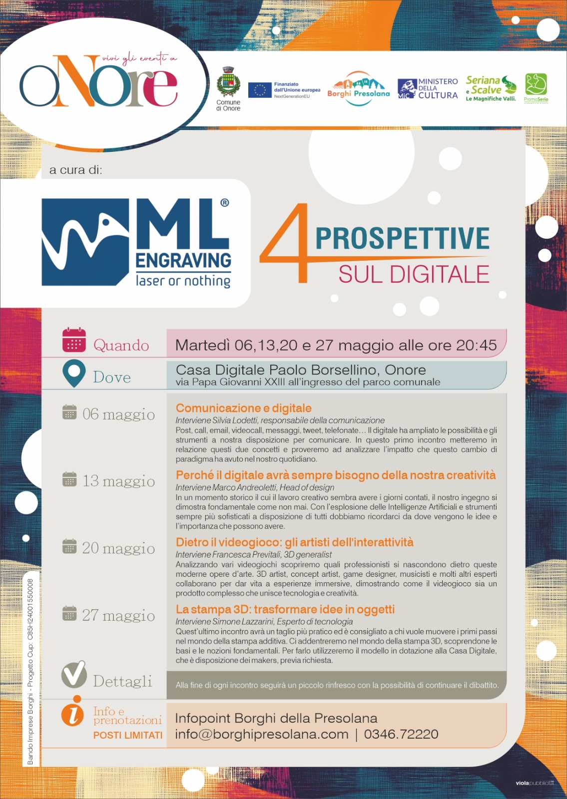 A maggio, grazie alla ML Engraving, prenderanno vita quattro corsi gratuiti dedicati al mondo digitale. Gli incontri si svolgeranno presso la Casa Digitale Paolo Borsellino di Onore, recentemente inaugurata. La partecipazione è gratuita, con prenotazione obbligatoria (anche per i singoli eventi) tramite l’Infopoint Borghi della Presolana. Al termine di ogni incontro, seguirà un rinfresco. Non lasciarti sfuggire questa occasione per accrescere la tua cultura digitale!