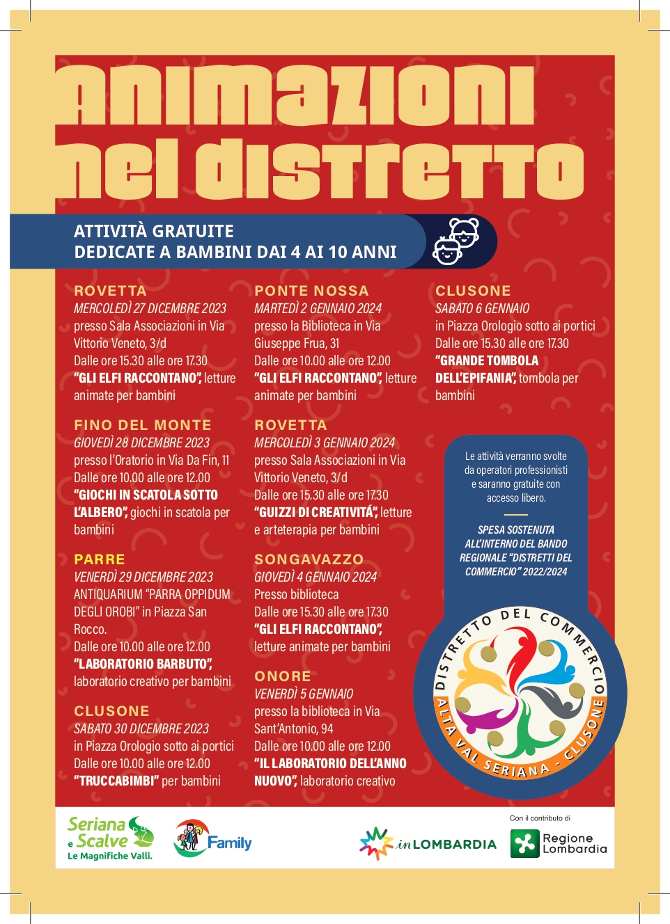 Dal 27 dicembre al 6 gennaio, il Distretto del Commercio Alta Valle Seriana Clusone organizza, per il periodo delle vacanze natalizie, delle animazioni per bambini e le loro famiglie.