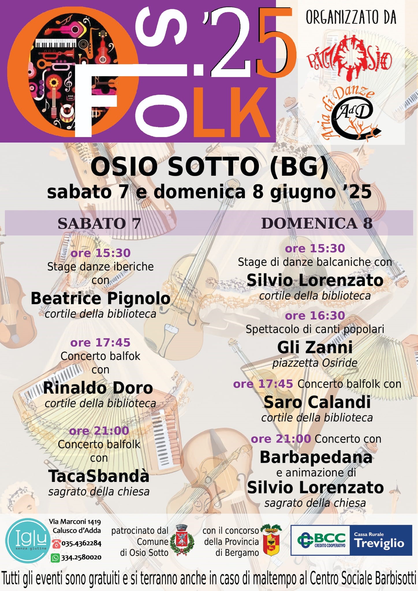 Torna anche quest’anno Osio Folk organizzato dalle associazioni RitmOsio e Aria di Danze con il patrocinio del Comune di Osio Sotto. Due giornate dedicate alla musica e alle danze popolari europee, con concerti, stage e momenti di incontro aperti a tutte e tutti. Il festival si svolgerà sabato 7 e domenica 8 giugno 2025, tra il cortile della biblioteca e il sagrato della chiesa, con un programma pensato per valorizzare le tradizioni musicali e coreutiche di diverse aree culturali, in un clima di condivisione e partecipazione.