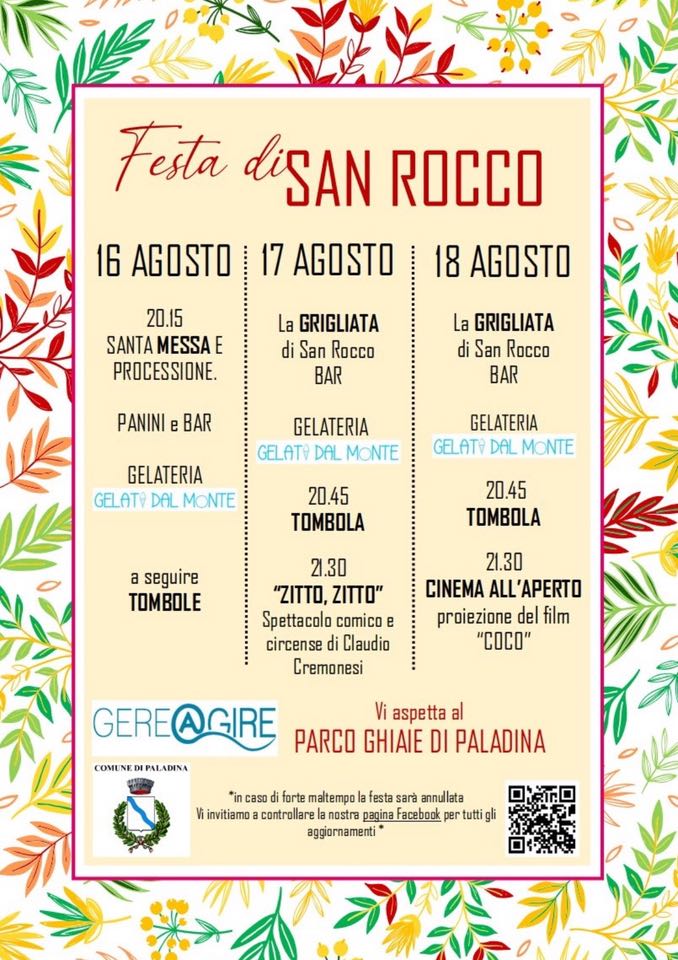 Sagra di San Rocco presso il parco pubblico delle Ghiaie di Paladina. Arricchita da spettacoli e proiezione di film all’aperto.