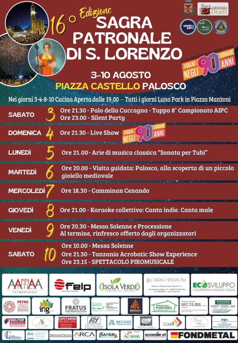 Arriva a Palosco la 16esima edizione della sagra Patronale di S. Lorenzo, otto giorni di attività e divertimento per tutti.