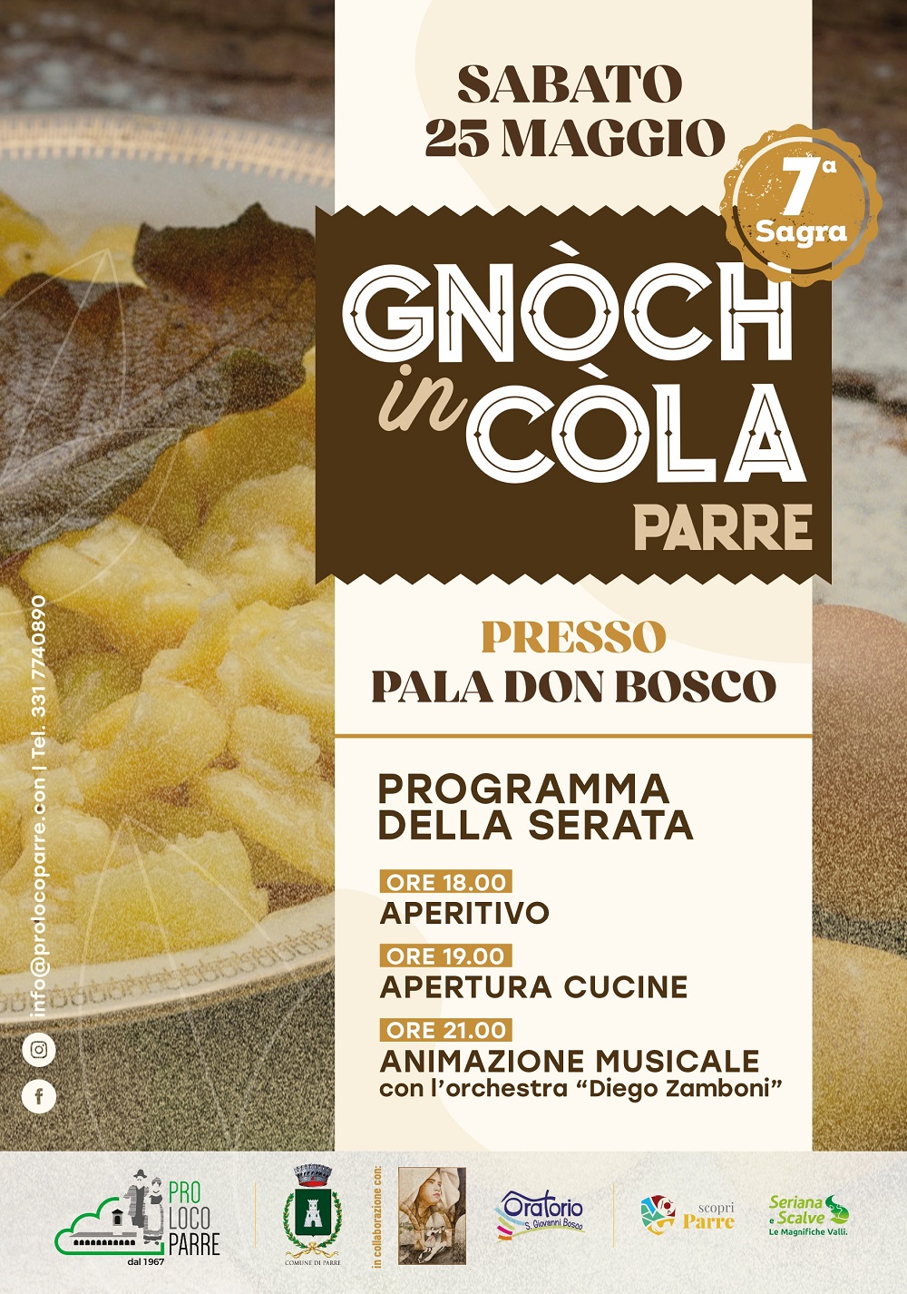 La Pro Loco Parre organizza la 7^ edizione della Sagra degli Gnòch in Còla! Presso il Pala Don Bosco dell'Oratorio di Parre passerete una serata all'insegna della tradizione parrese. Programma: