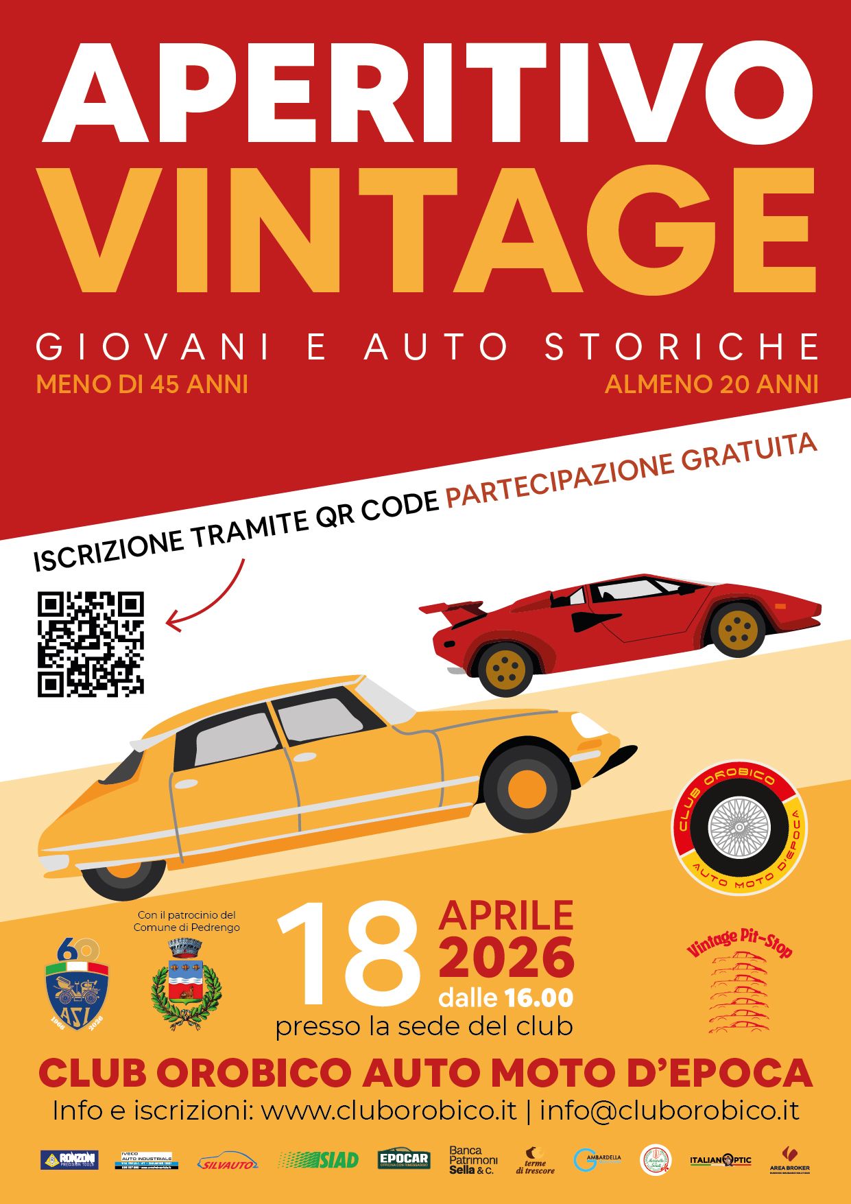 Un pomeriggio allโinsegna della passione per i motori e dello stile senza tempo. Sabato 18 aprile, presso la sede del Club Orobico Auto Moto dโEpoca a Pedrengo, prende vita unโiniziativa pensata esclusivamente per i giovani tra i 20 e i 45 anni: un aperitivo vintage dove incontrarsi, condividere interessi e immergersi nel fascino delle auto e moto storiche. Unโoccasione per avvicinarsi al mondo dei veicoli dโepoca in un contesto informale, tra chiacchiere, curiositร e dettagli che raccontano storie di altri tempi. Dalle 16.00, la sede del club si trasforma in un vero e proprio punto di ritrovo per una nuova generazione di appassionati, tra atmosfere vintage e spirito conviviale. Lโiniziativa si svolge con il patrocinio del Comune di Pedrengo.