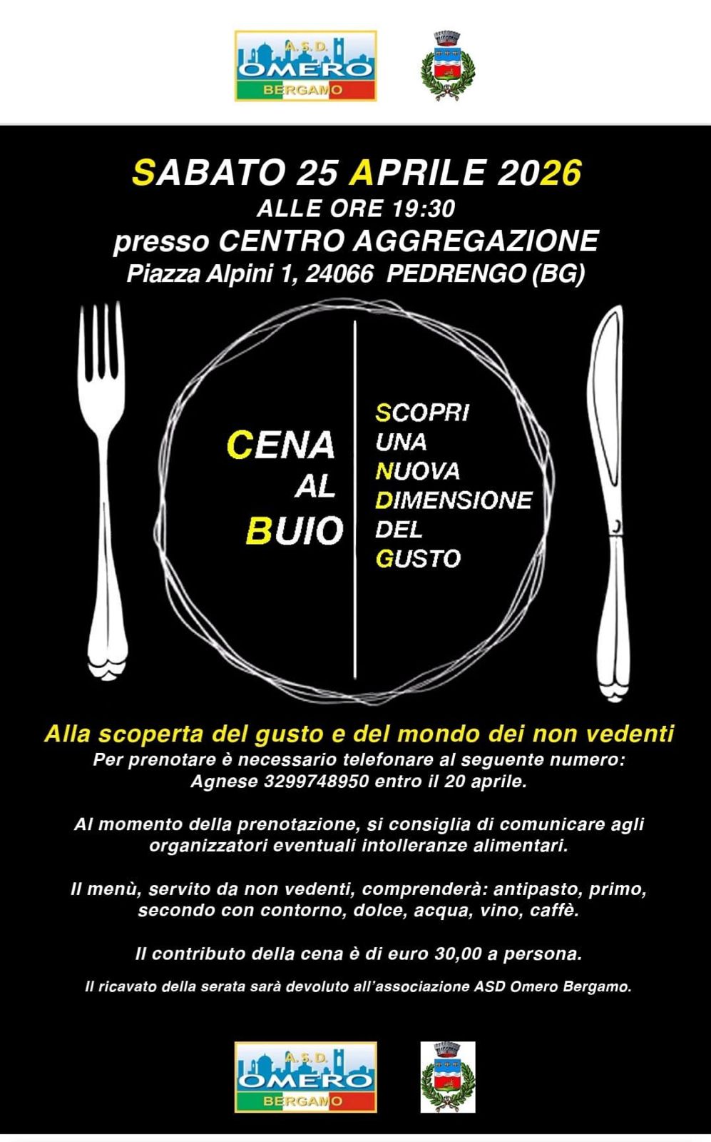 Sabato 25 aprile alle 19:30, presso il Centro Aggregazione di Piazza Alpini 1 a Pedrengo, รจ in programma una Cena al Buio, unโesperienza pensata per scoprire una nuova dimensione del gusto e avvicinarsi al mondo dei non vedenti.