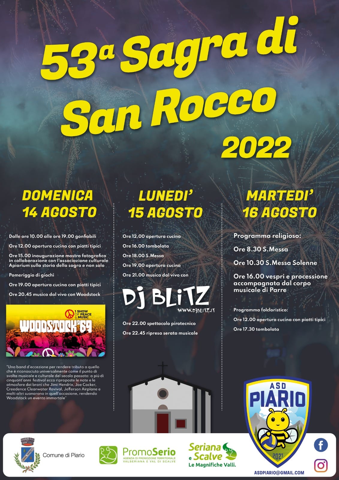 A Piario torna dopo due anni la storica Sagra di San Rocco: l'appuntamento con la cinquantatreesima edizione è in località San Rocco con le tradizionali celebrazioni religiose nell'omonima chiesetta e un programma di pranzi e cene con specialità gastronomiche locali e animazione musicale tutte le sere nella tensostruttura allestita nel prato adiacente.