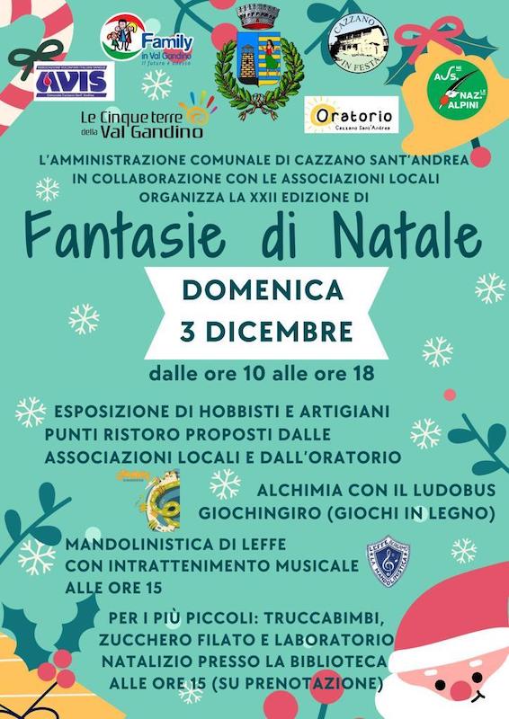 L'Amministrazione Comunale di Cazzano Sant'Andrea in collaborazione con le associazioni organizzano la 22a edizione di "Fantasie di Natale", dalle ore 9:00 alle ore 17:30 lungo le vie del paese. Durante la giornata esposizione di numerosi hobbisti e artigiani e punti ristoro proposti dalle associazioni locali e dall'Oratorio.
