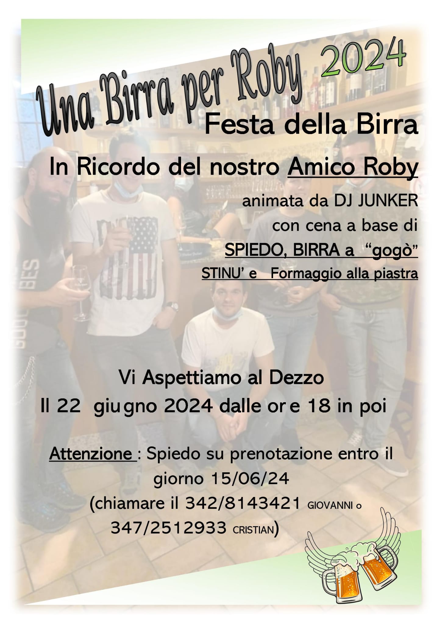 Festa della birra in ricordo di Roby, a partire dalle ore 18:00 fino a sera inoltrata. Serata animata da dj Junker, con cena a base di spiedo, birra, strinù e formaggio alla piastra. Per lo spiedo è necessaria la prenotazione, entro il 15/06, chiamando: 342.8143421- Giovanni 347.2512933- Cristian Vi aspettiamo numerosi al Dezzo, frazione di Azzone, nei pressi del porticato della chiesa! Maggiori informazioni nella locandina in allegato