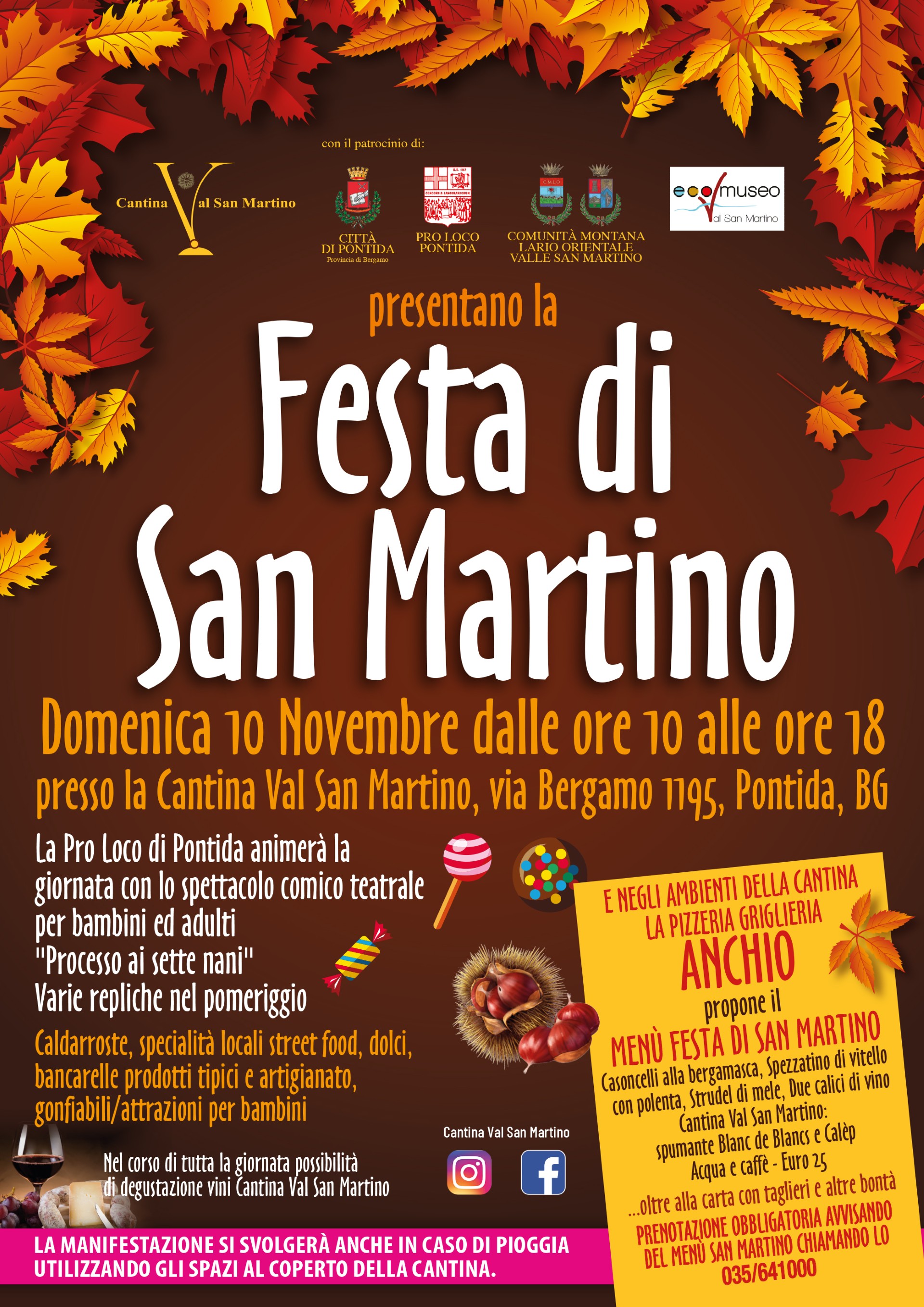 La Cantina Val San Martino di Pontida insieme alla Pro Loco Pontida, organizzano la quarta edizione della Festa di San Martino, con caldarroste, bancarelle e lo spettacolo comico teatrale "Processo ai sette nani".