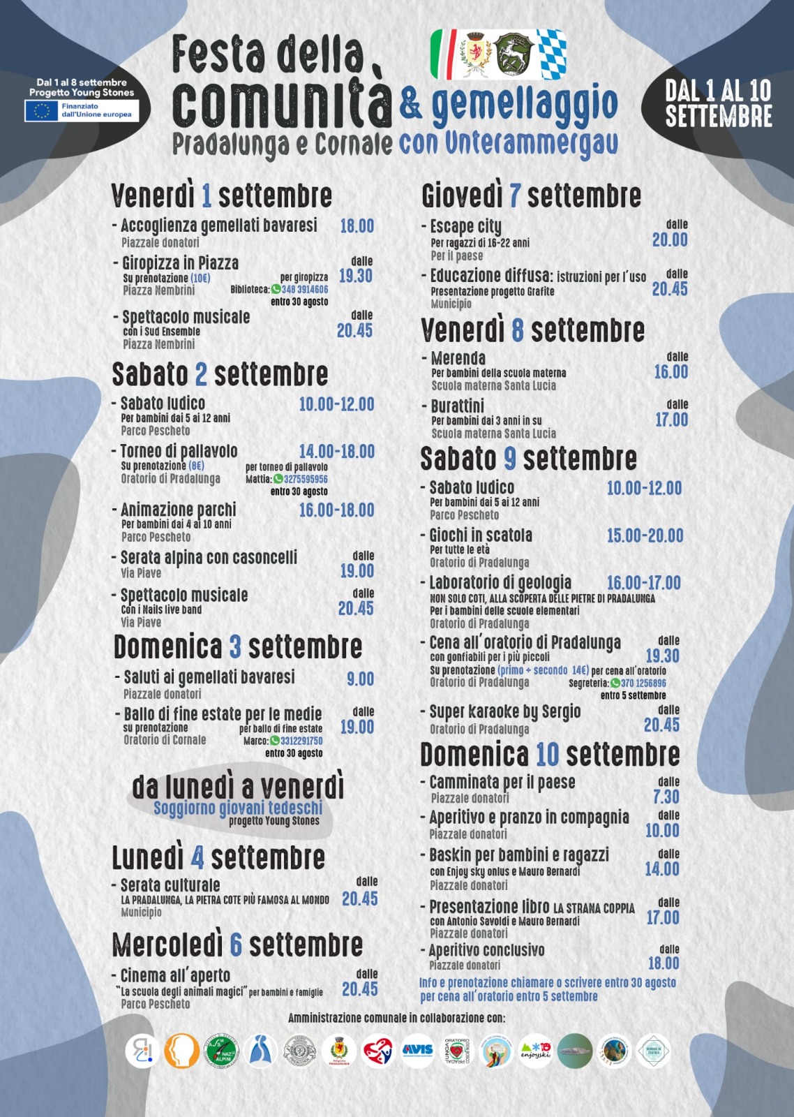 La festa di comunità di Pradalunga e Cornale dal 1 al 10 settembre 2023 sarà animata attraverso momenti condivisi in cui la comunità sarà sia protagonista che destinataria di attività pensate e realizzate insieme. Per l'occasione avremo come ospiti anche i nostri amici bavaresi di Unterammergau.