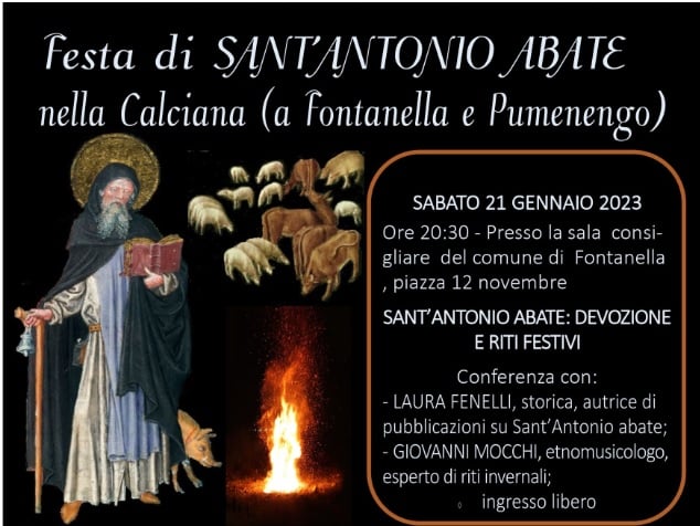 Ore 17:00 – Benedizione degli animali e, a seguire, falò di Sant’Antonio con bevande calde, tortelli di sant’Antonio (frittelle), dolci vari (contributo di 5 euro).