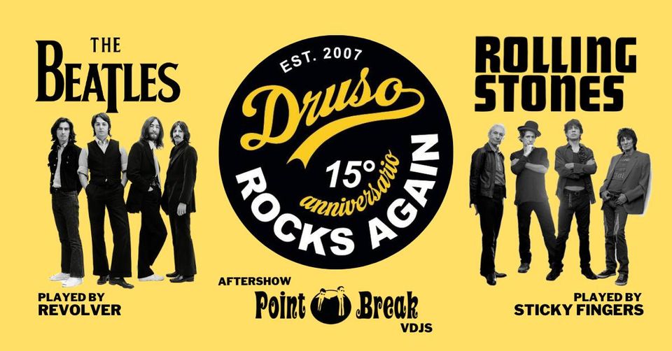 Il live set prevedrร come da tradizione la messa in scena della piรน grande "rivalitร " della storia della musica, quella tra Beatles e Rolling Stones. Due super band si alterneranno sul palco in compagnia di tanti ospiti e dopo lo show si ballerร fino allo sfinimento con i Point Break VDj.