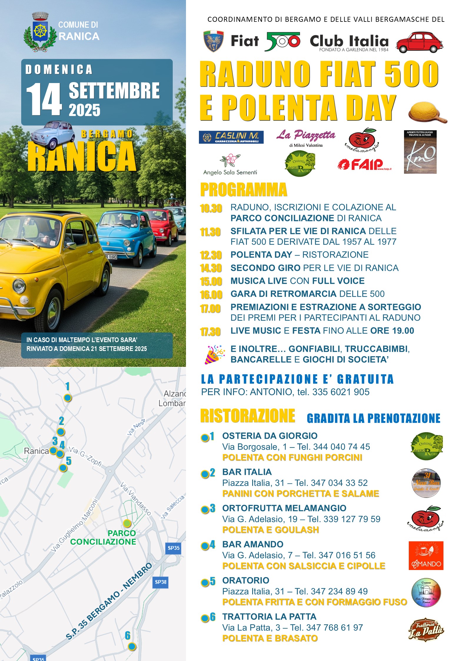 Il Comune di Ranica è lieto di invitare tutta la cittadinanza e gli appassionati di motori e tradizioni locali al Raduno Fiat 500 e Polenta Day, in programma domenica 14 settembre presso il Parco Conciliazione di Ranica.