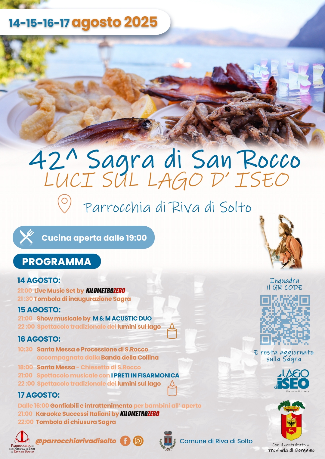 Una manifestazione che unisce tradizione religiosa, intrattenimento per tutte le etร e sapori locali: dal 14 al 17 agosto 2025, Riva di Solto celebra la 42esima Sagra di San Rocco con serate di musica dal vivo, cucina tipica, spettacoli di luci sul lago.