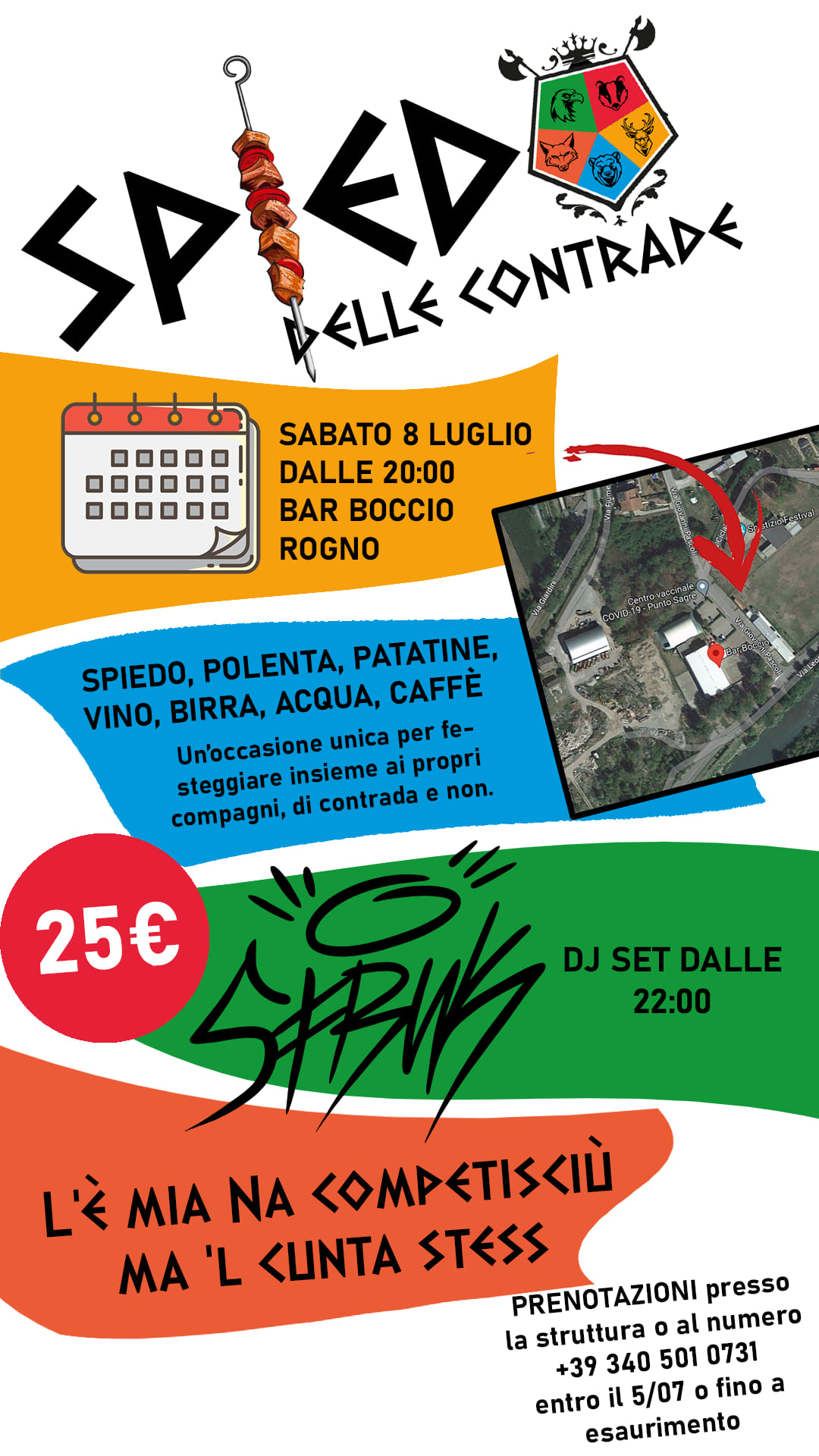 La Pro Loco di Rogno, in collaborazione con l'Amministrazione Comunale, organizza il Palio delle Contrade, che si terrà da lunedì 26 giugno a sabato 8 luglio 2023. Le contrade si sfideranno in tornei di calcio, tiro alla fune, corsa coi sacchi, beach volley e, come novità per questa edizione, a "tòlamela" e "all you can pasta".