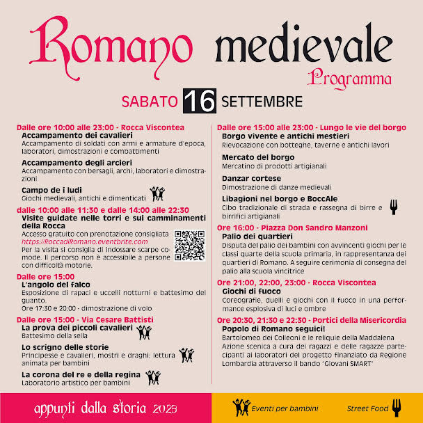 Prosegue "Romano medievale. Appunti dalla storia 2023", un weekend di festa per le vie del centro storico di Romano di Lombardia, con tante attività come l'accampamento dei cavalieri, giochi di fuoco e il palio dei quartieri.