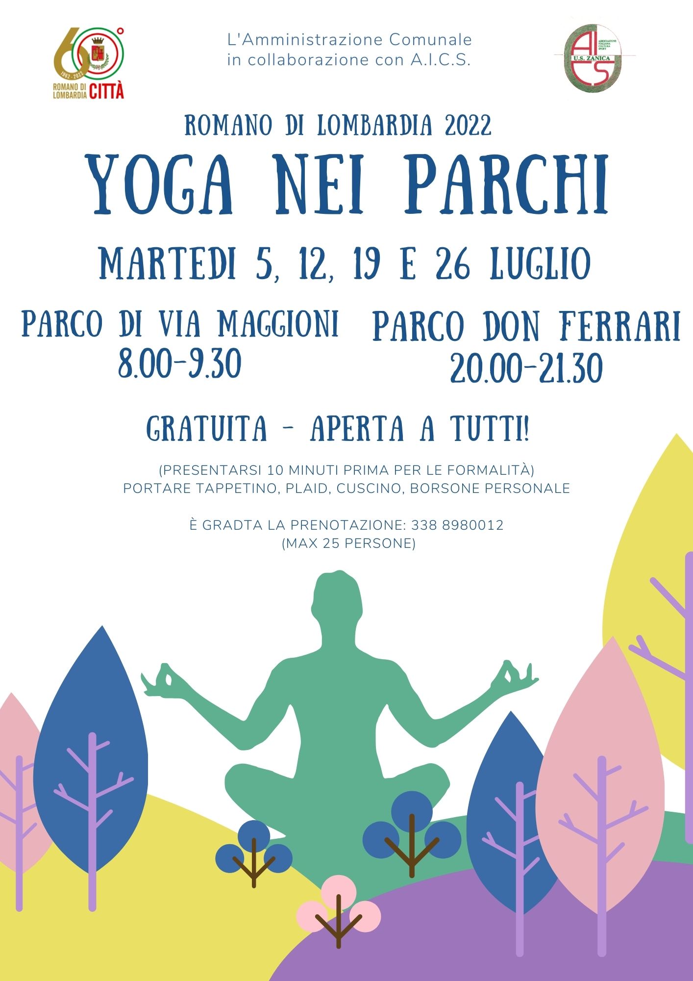 Martedì 5 luglio al parco Don Ferrari a Romano di Lombardia dalle 8.00 alle 9.30 si terrà una lezione di yoga all'aria aperta immersi nella natura organizzata da A.I.C.S. Zanica.
