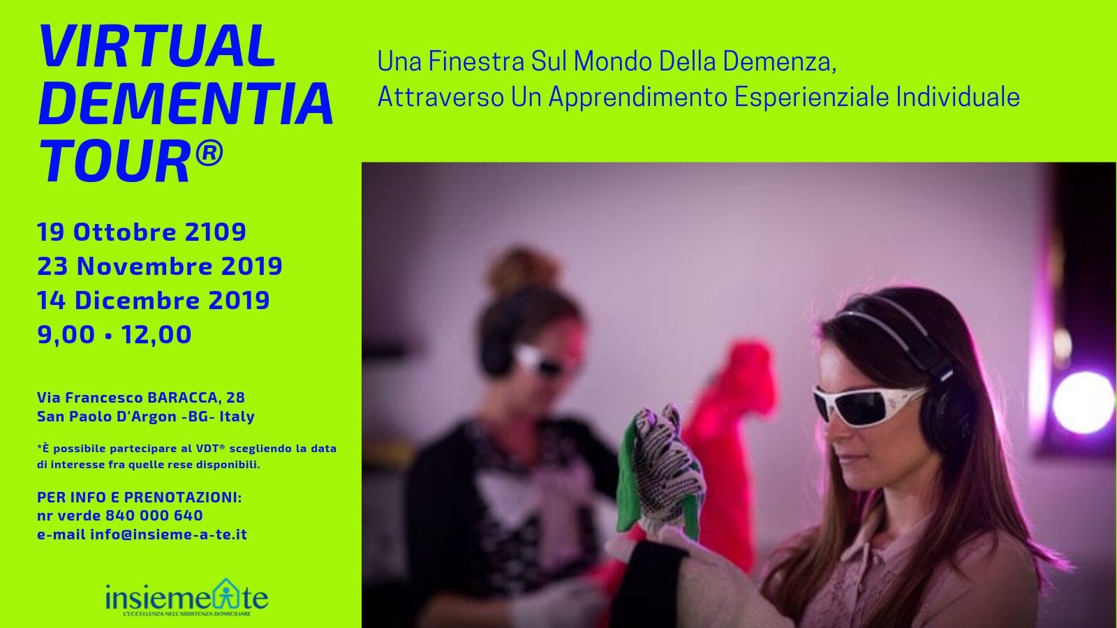 Per maggiori informazioni circa il Virtual Dementia Tour® è possibile visitare il nostro sito internet: http://www.insieme-a-te.it/virtual-dementia-tour/