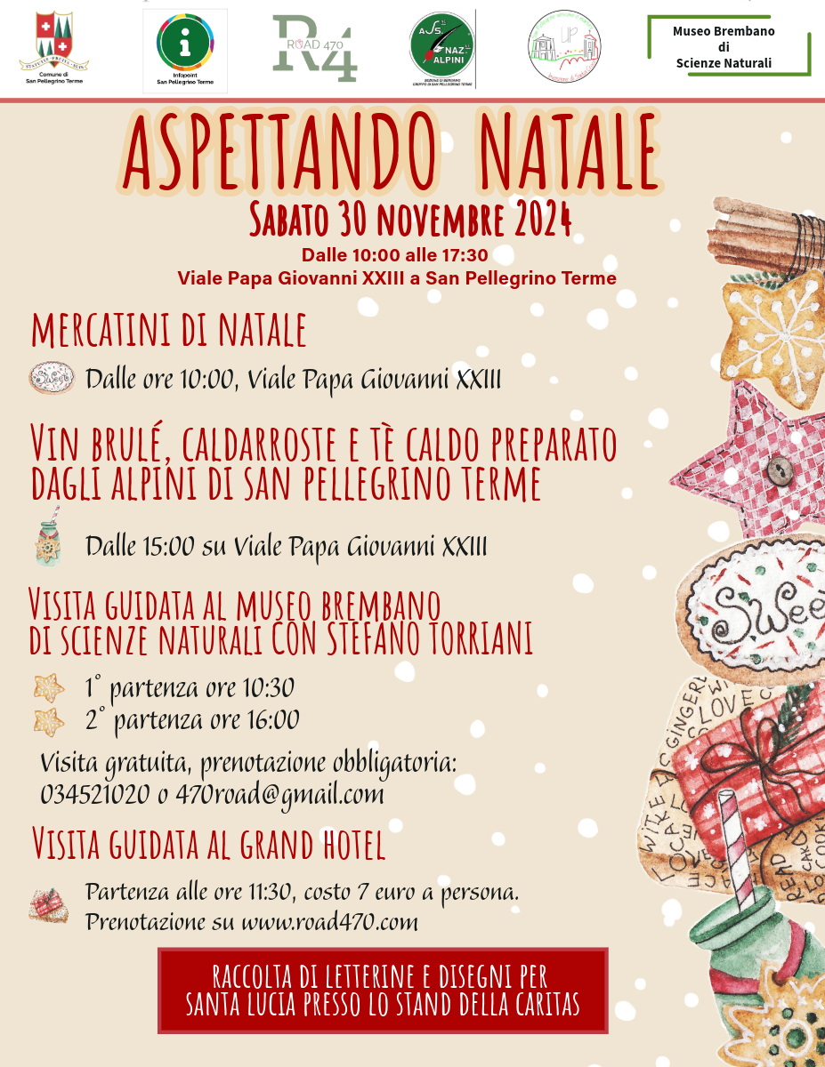 Mercatini di Natale dalle 10, su Viale Papa Giovanni XXIII. Dalle 15 vin brulé, caldarroste e té caldo preparato dagli Alpini di San Pellegrino Terme.