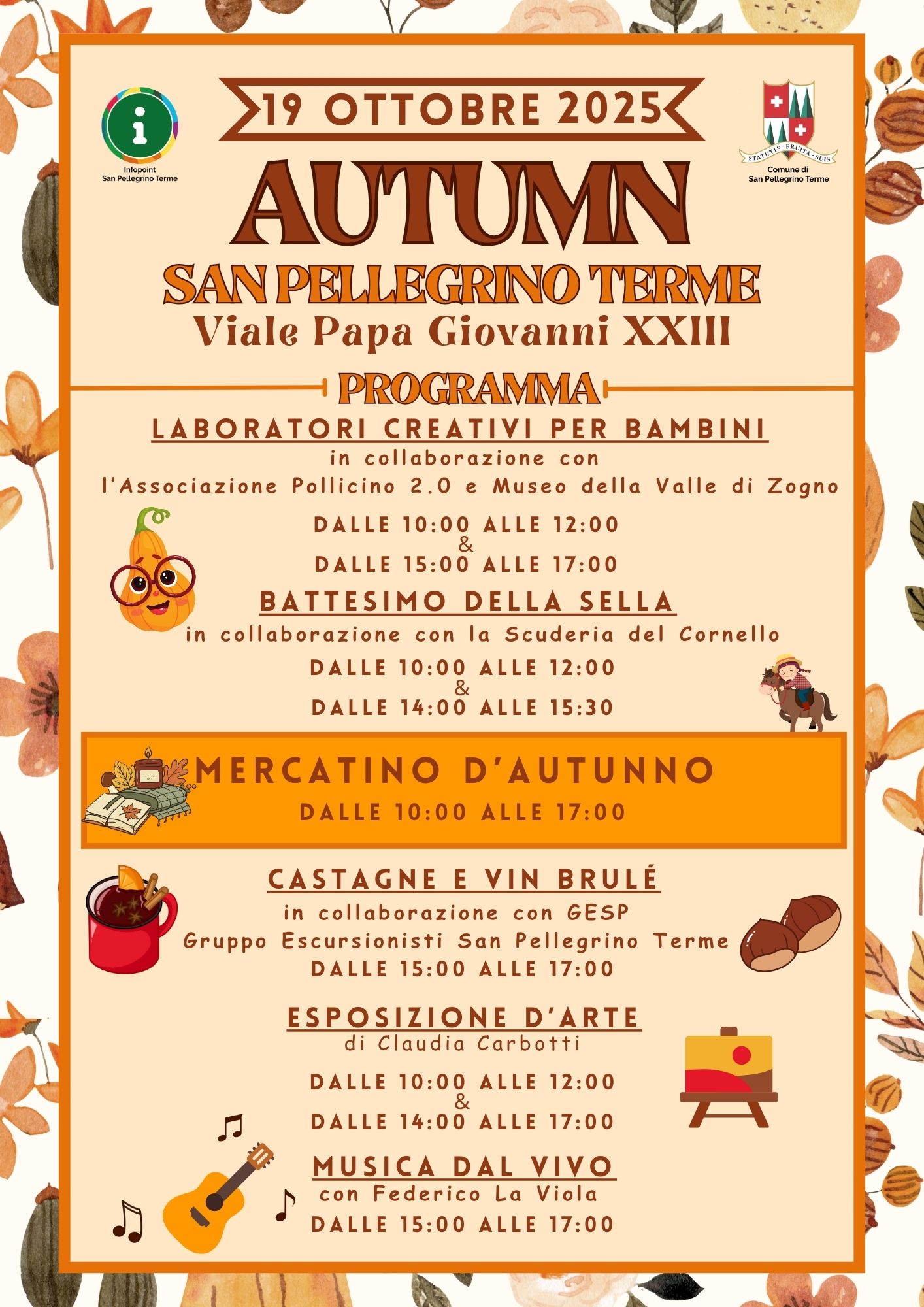 Vivi la magia dell'autunno a San Pellegrino Terme con una giornata ricca di colori, profumi e sapori, pensata per coinvolgere grandi e piccoli in un’atmosfera calda e accogliente.