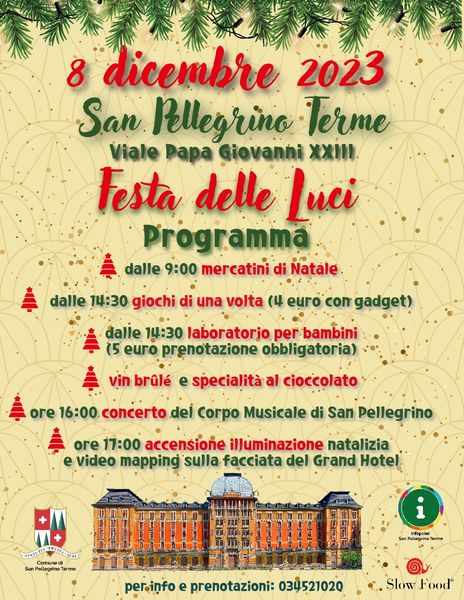 Giornata ricca di eventi per festeggiare insieme l'arrivo del Natale: mercatini, giochi, merende e illuminazione del paese e del Grand Hotel
