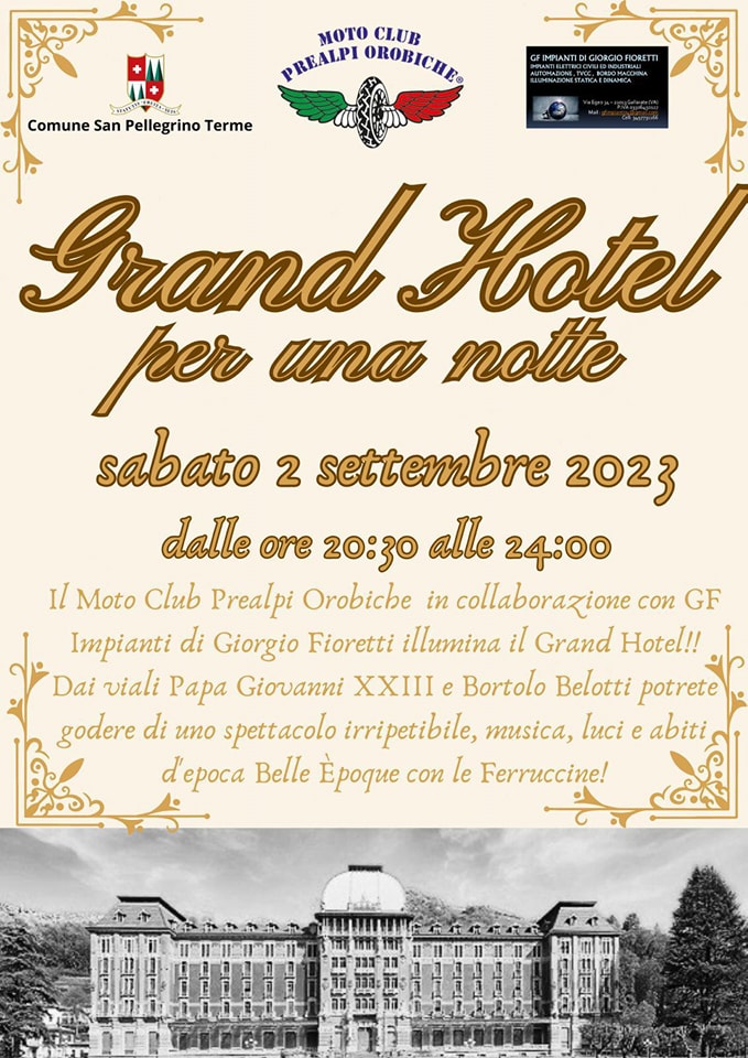 Il Moto Club Prealpi Orobiche in collaborazione con GF Impianti, illumina il Grand Hotel; dai viali Papa Giovanni XXIII e Bortolo Belotti si potrร godere di uno spettacolo irripetibile con musica, luci e abiti della Belle รpoque.