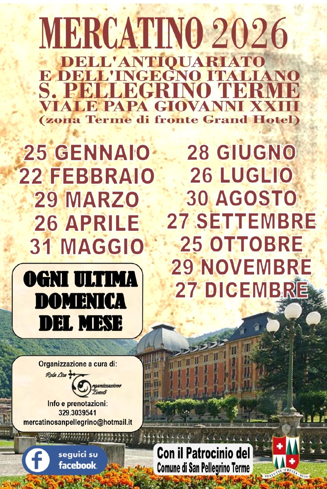 Domenica 29 marzo a San Pellegrino Terme sul viale Papa Giovanni, con orario dalle 9 alle 17, sarà la nuova data del mercatino dell'Antiquariato e dell'Ingegno Italiano, come sempre l'ultima domenica del mese.