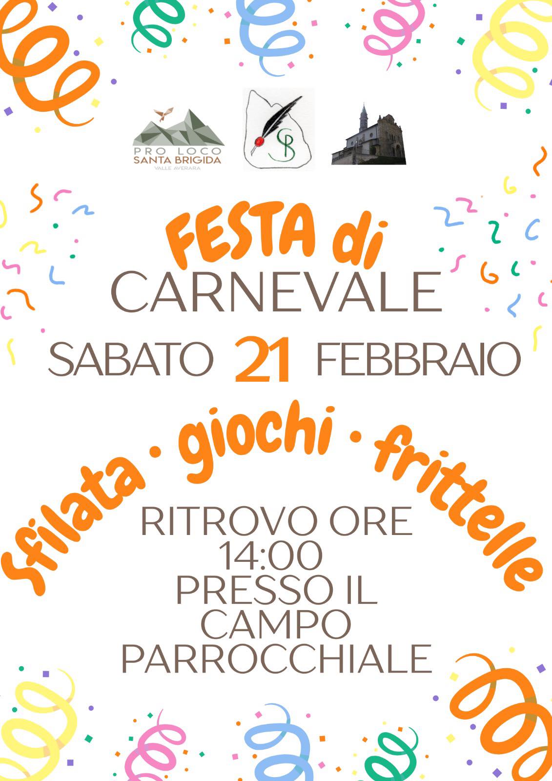 La Pro Loco di Santa Brigida organizza una festa di Carnevale con giochi, musica e una grande sfilata di maschere per tutti i bambini.