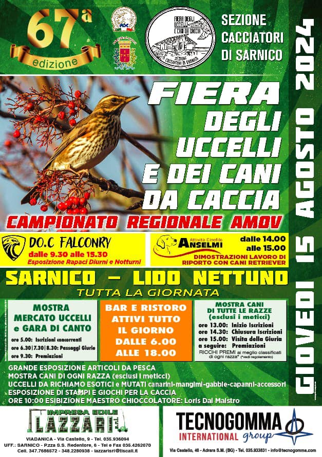 Giovedì 15 agosto 2024, presso il Lido Nettuno di Sarnico ci sarà la 67ª Fiera degli Uccelli e dei Cani da Caccia.