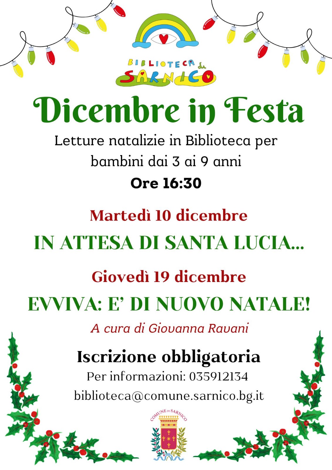 Nell’ambito dell’evento “Sarnico Magic Christmas...Un Natale a Colori”, giovedì 19 dicembre 2024, alle 16,30, avrà luogo la lettura per bambini "Evviva: è di nuovo Natale!" presso la Biblioteca Comunale di Sarnico.