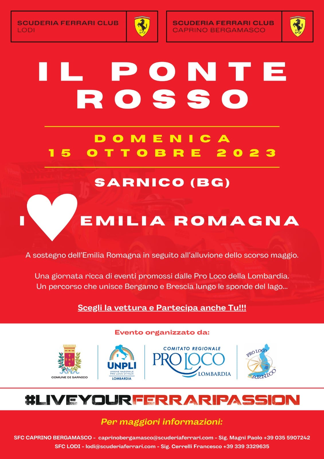 Domenica 15 ottobre, avrò luogo a Sarnico "Il ponte rosso", una giornata ricca di eventi promossi dalle Pro Loco della Lombardia. Protagoniste saranno le vetture Ferrari in un percorso che unisce Bergamo e Brescia lungo le sponde del lago.