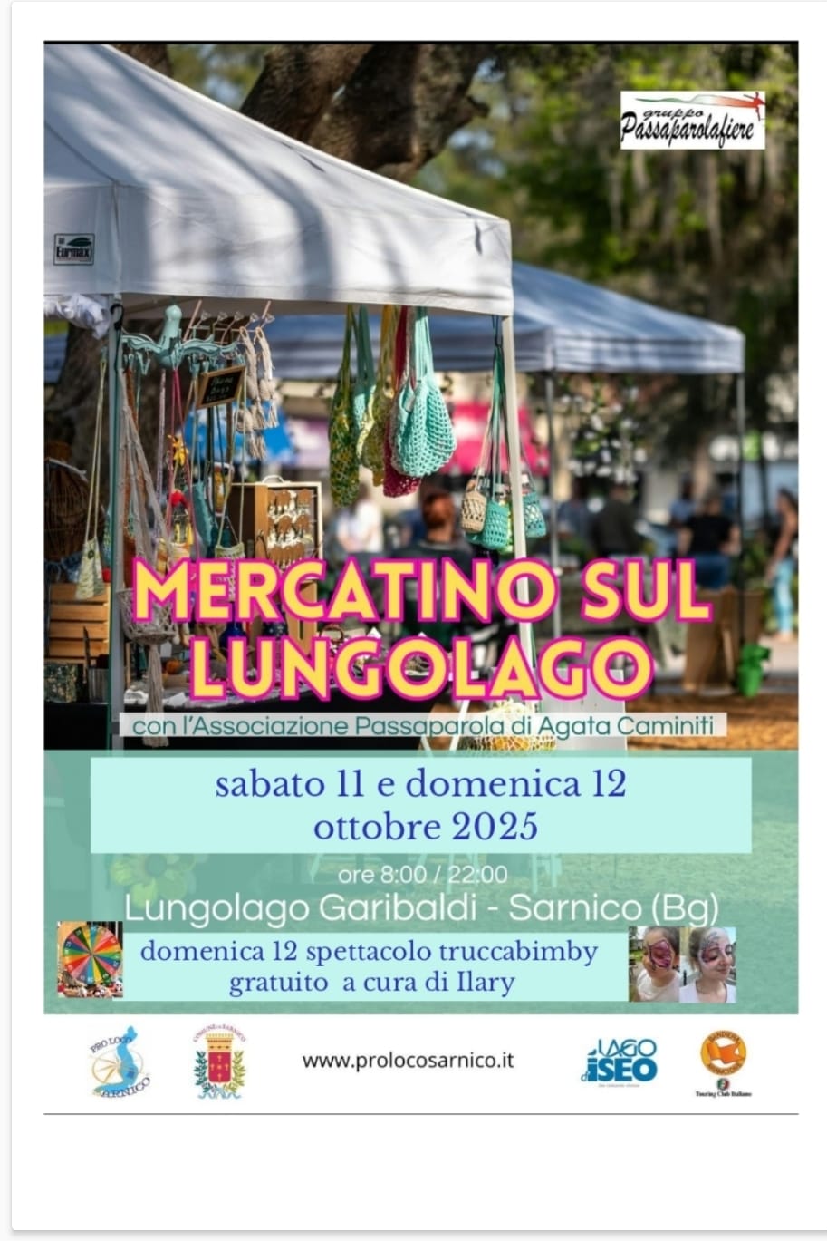 Sabato 11 e domenica 12 ottobre, dalle 8 alle 22, si terrà il Mercatino sul lungolago di Sarnico, con l'Associazione Passaparola di Agata Caminiti.