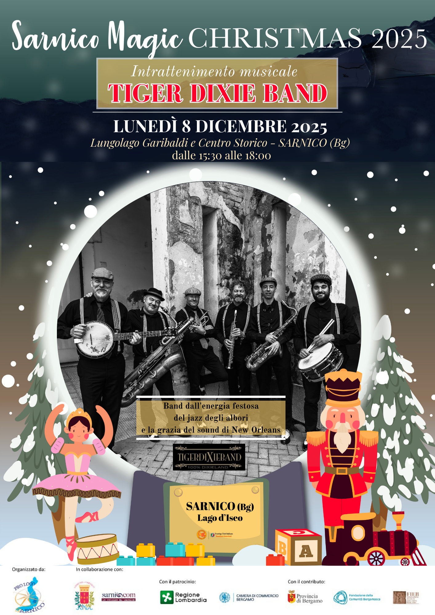 Nell'ambito dell'evento «Sarnico Magic Christmas», lunedì 8 dicembre 2025, dalle 15:30 alle 18:00, la street band Tiger Dixie Band si esibirà a Sarnico per una festa a cielo aperto.