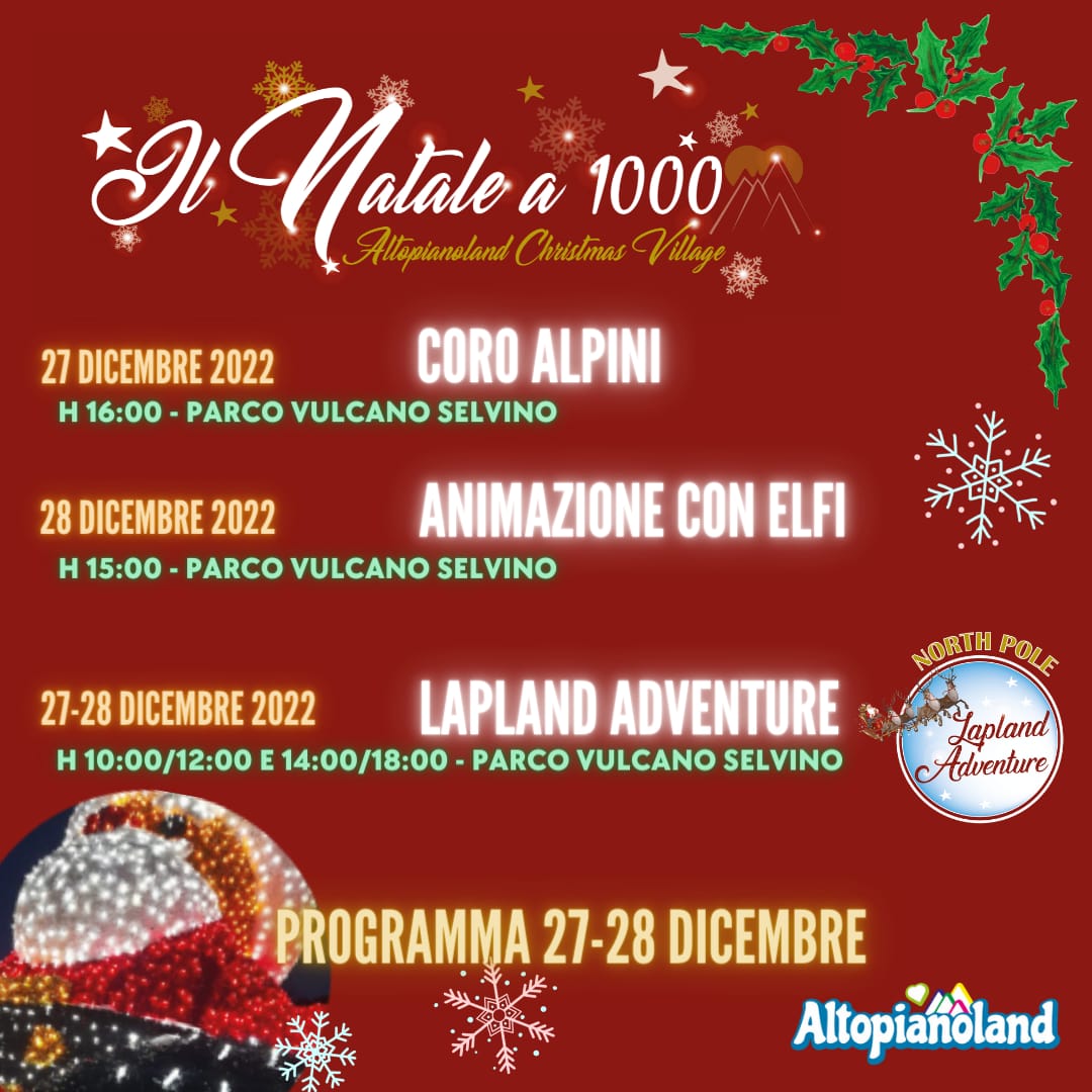 Per Natale a 1000, il centro di Selvino sarร sede dellโAltopianoland Christmas Village con diverse attivitร dedicate soprattutto ai piรน piccoli, dove giochi e strutture luminose faranno vivere un magico sogno ai turisti che frequentano l'Altopiano.