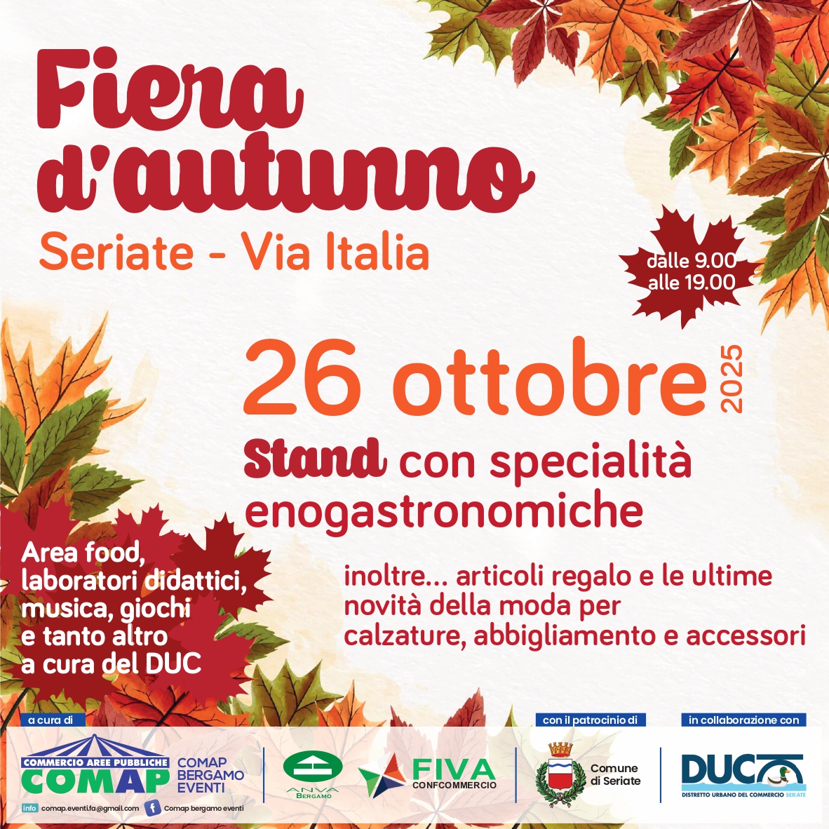 Torna a Seriate la Fiera d'Autunno, una giornata tra colori, sapori e commercio di vicinato. Il centro della città si trasformerà in un grande mercato a cielo aperto, con stand, musica e attività per famiglie, per riscoprire il piacere di vivere la città.