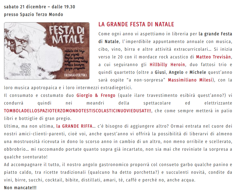 Come ogni anno vi aspettiamo in libreria per la grande Festa di Natale, l’imperdibile appuntamento annuale con musica, cibo, vino, birra e altre attività extracurricolari… Si inizia verso le 20 con il mordace rock acustico di Matteo Trevisàn, a cui seguiranno gli Hillbilly Heroin, duo fattosi trio e quindi quartetto (oltre a Giusi, Angelo e Michele quest’anno sarà ospite “a non-sorpresa” Massimiliano Milesi), con la loro musica apotropaica e i loro intermezzi extradiegetici.