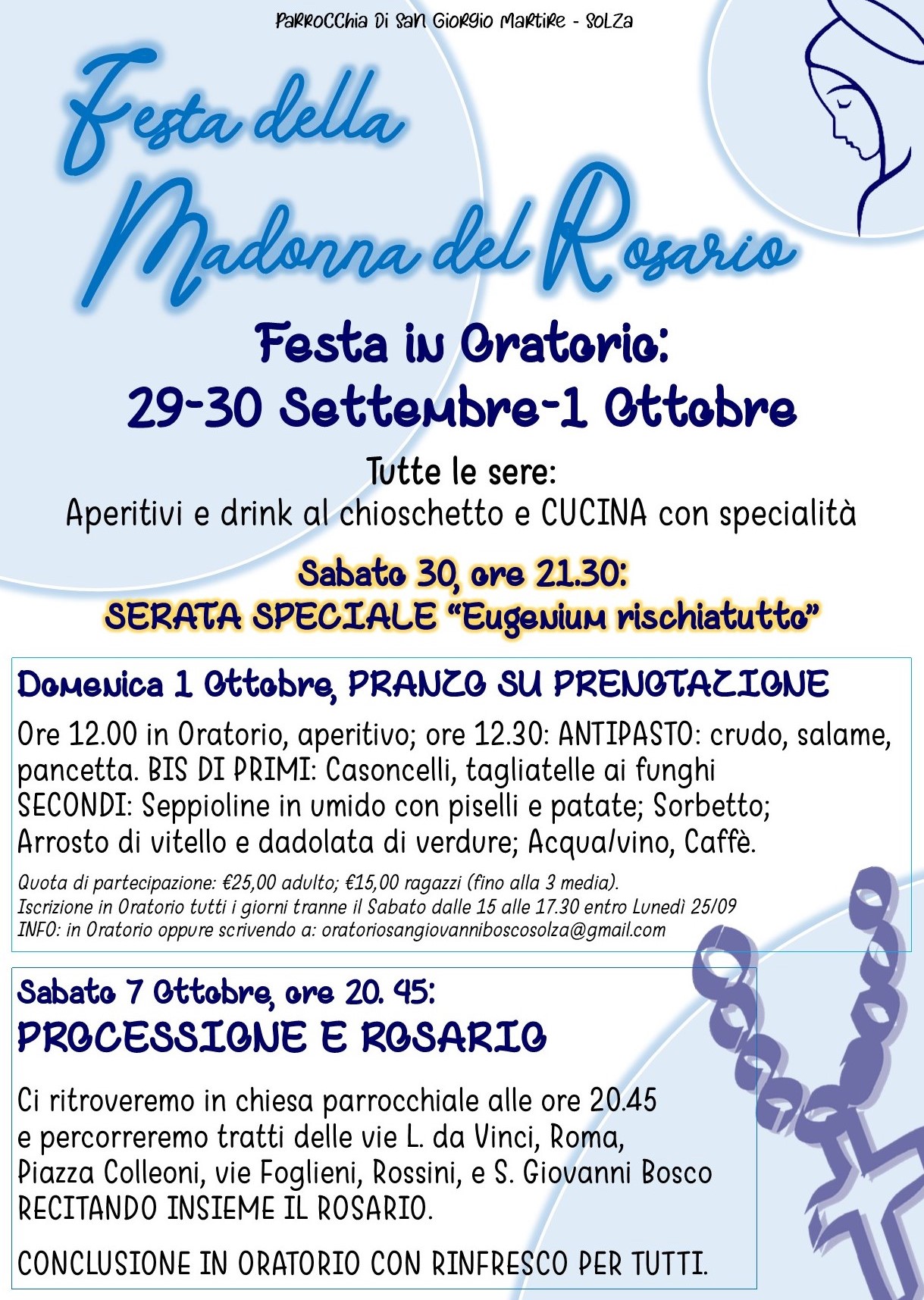 Presso l'oratorio di Solza in provincia di Bergamo, in via San Giovanni Bosco, si terrà il 29, 30 settembre e 1 ottobre la festa della Madonna del Rosario.