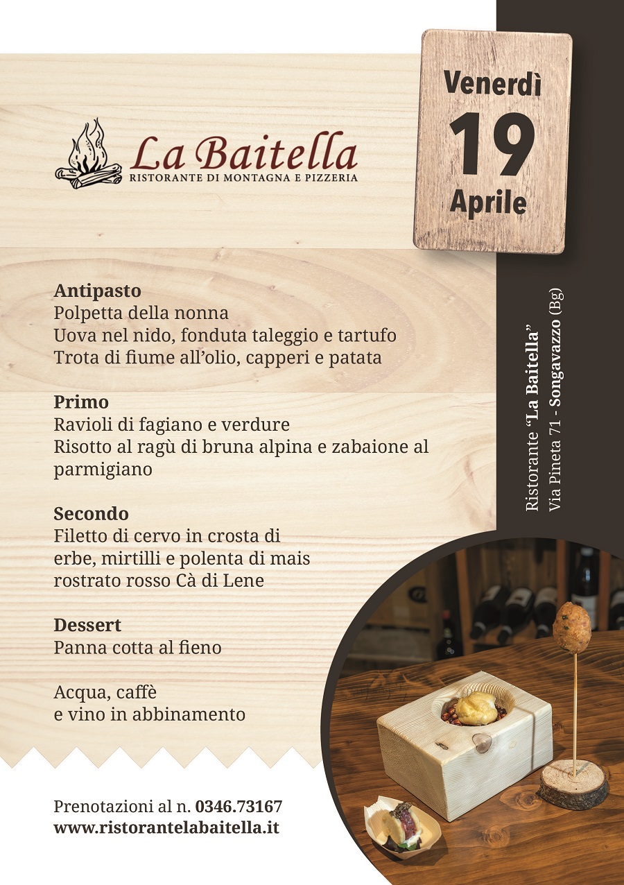 Il Distretto del Commercio Alta Valle Seriana propone un percorso culinario alla scoperta dei prodotti tipici del territorio attraverso piatti rivisitati dagli chef dei ristoranti aderenti. Il quinto appuntamento è presso il ristorante "La Baitella".