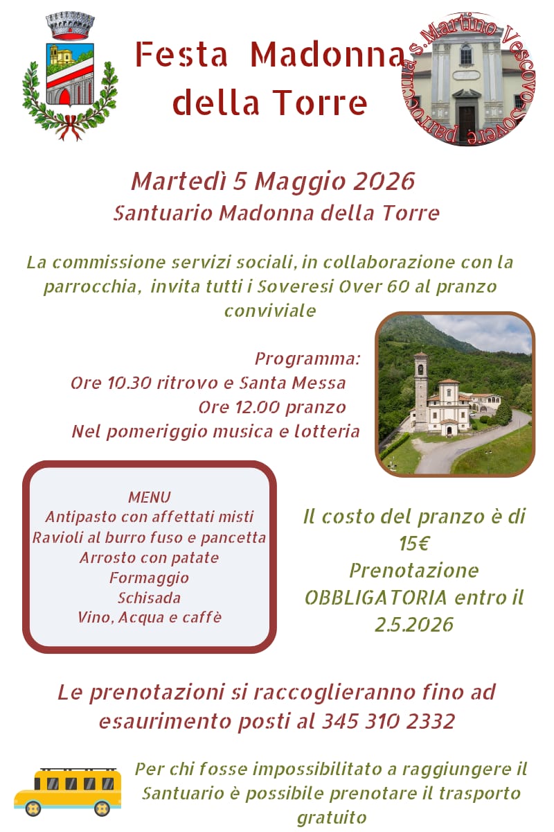 Presso il Santuario di Sovere, si terrร la tradizionale festa della Madonna della Torre, con pranzo e un pomeriggio di musica e lotteria.