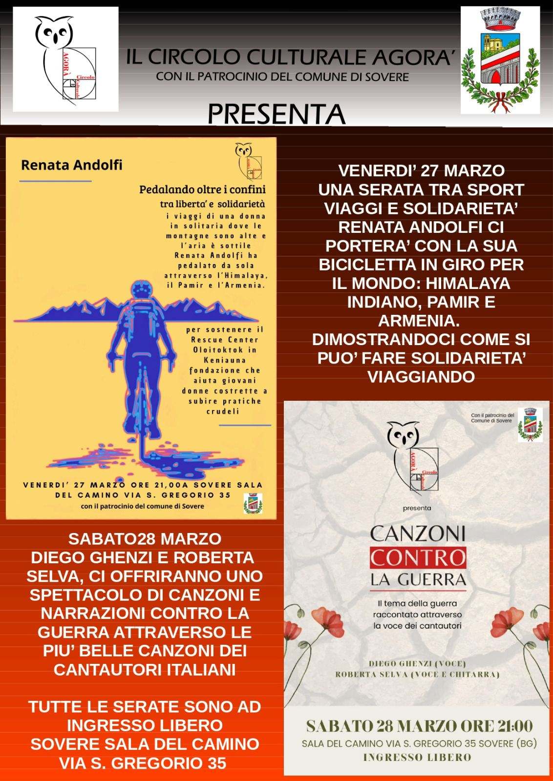 Il Circolo Culturale Agorà di Sovere, nel mese di marzo, organizza due incontri di solidarietà ad ingresso libero, che si terranno nella sala del camino della biblioteca, in via San Gregorio 35: