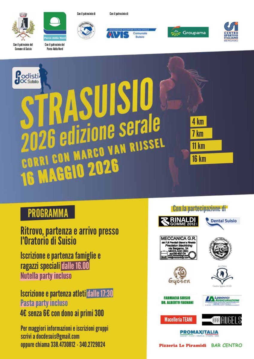 Quest'anno torna la versione serale della Strasuisio! Il 16 maggio in programma percorsi da 4-7-11-16 km.