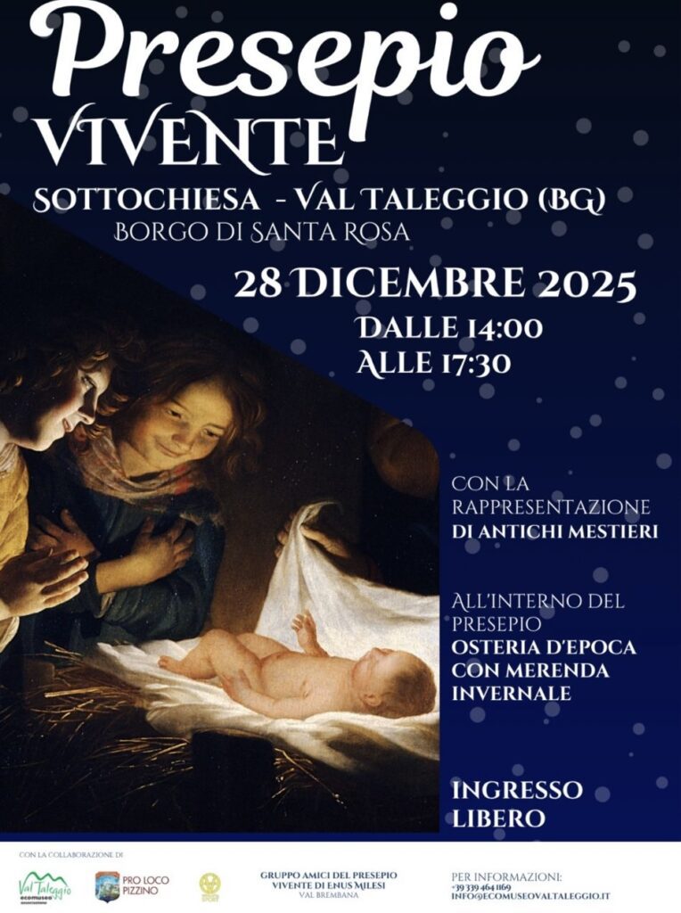 Il Presepio vivente si terrà il giorno 28 Dicembre a Sottochiesa - Val Taleggio (BG), specificamente nel Borgo di Santa Rosa. L'evento si svolgerà nel pomeriggio, con orario dalle 14:00 alle 17:30.