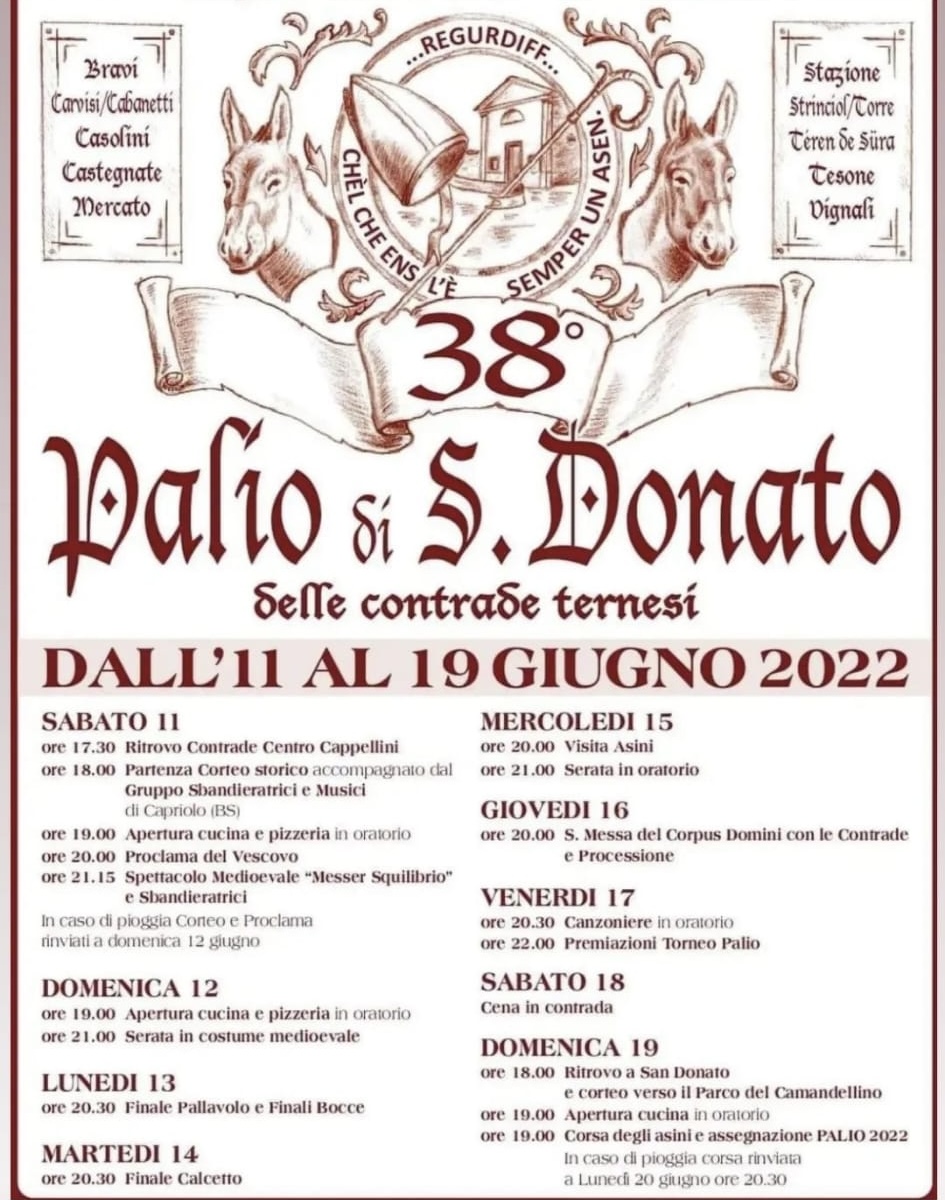 A seguire avverranno le premiazioni dei tornei sportivi di calcio, pallavolo e bocce del 38° Palio di San Donato.
