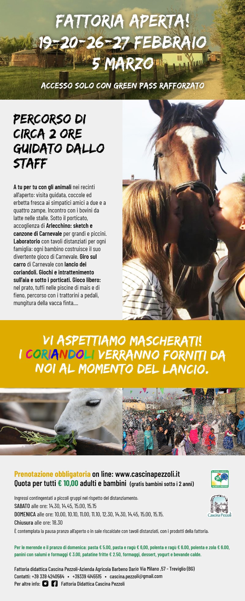 In occasione del Carnevale, la fattoria didattica Cascina Pezzoli propone un'esperienza unica in mezzo alla natura con tante attivitร pensate per far divertire i piรน piccoli.