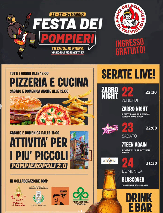LโAssociazione Amici dei Pompieri di Treviglio, con il patrocinio della Cittร di Treviglio e in collaborazione con i Vigili del Fuoco Volontari, รจ lieta di invitare il pubblico alla giornata conclusiva della Festa dei Pompieri presso Treviglio Fiera in Via Roggia Moschetta 13.