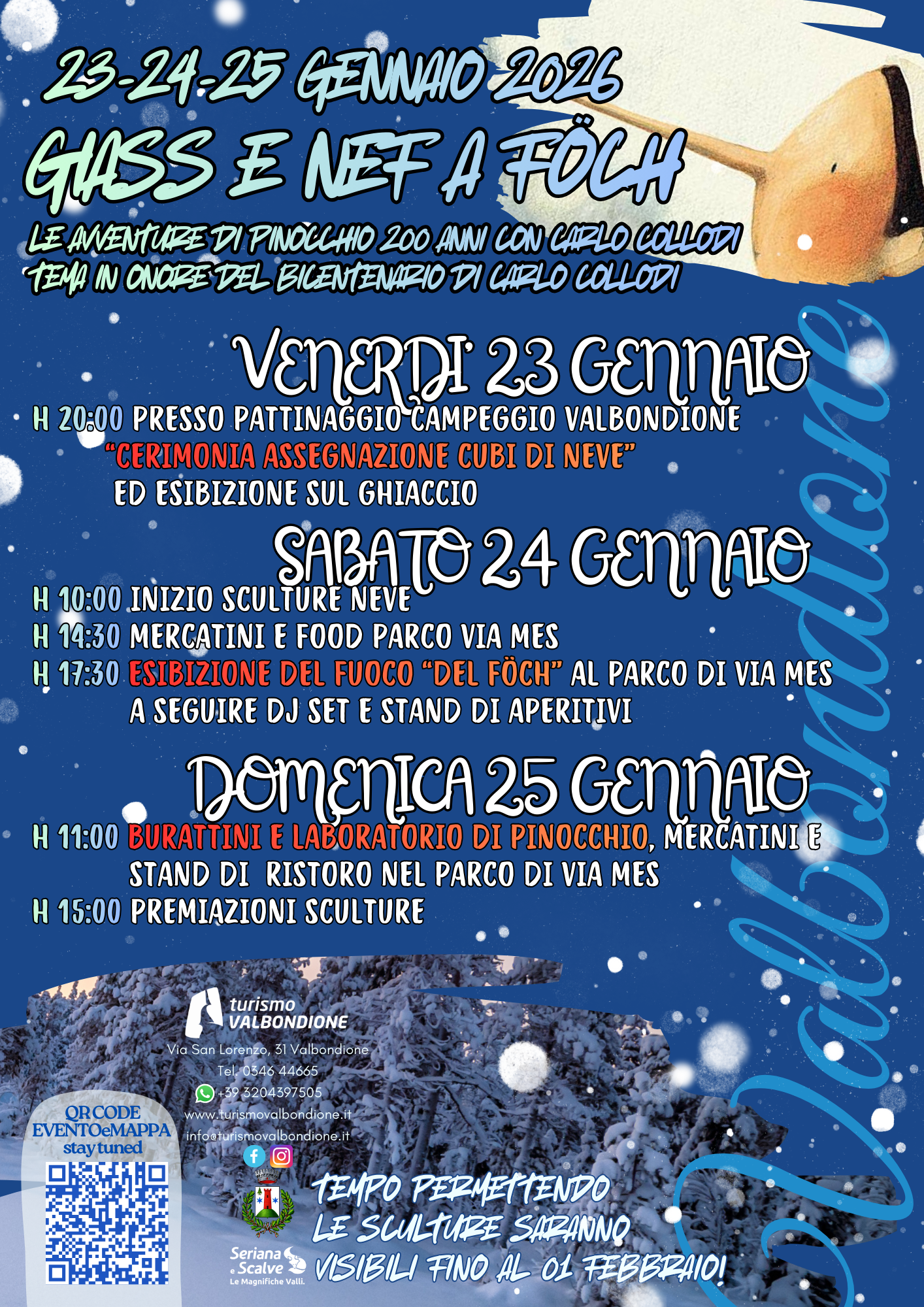 Il freddo diventa magia per le vie di Valbondione venerdì 23, sabato 24 e domenica 25 gennaio. Enormi blocchi di neve e ghiaccio con numerosi appassionati scultori con il contrasto del fuoco per creare grandi emozioni, quest’anno a tema “Le avventure di Pinocchio 200 anni con Carlo Collodi” tema in onore del bicentenario di Carlo Collodi.