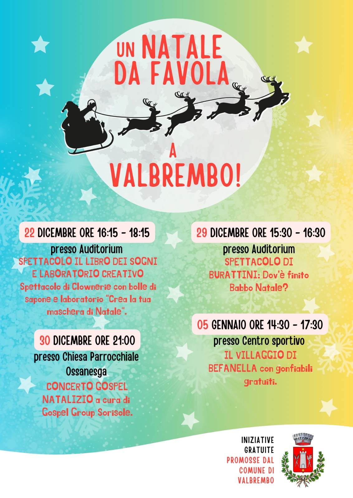 Un percorso tra libri, spettacolo di burattini, concerto Gospel e il Villaggio di Befanella, percorrerà il periodo Natalizio a Valbrembo. Numerose le iniziative gratuite che coinvolgeranno sia i più piccoli che famiglie per vivere le vacanze di Natale in compagnia e accompagnati dal clima dolce e festoso del Natale.