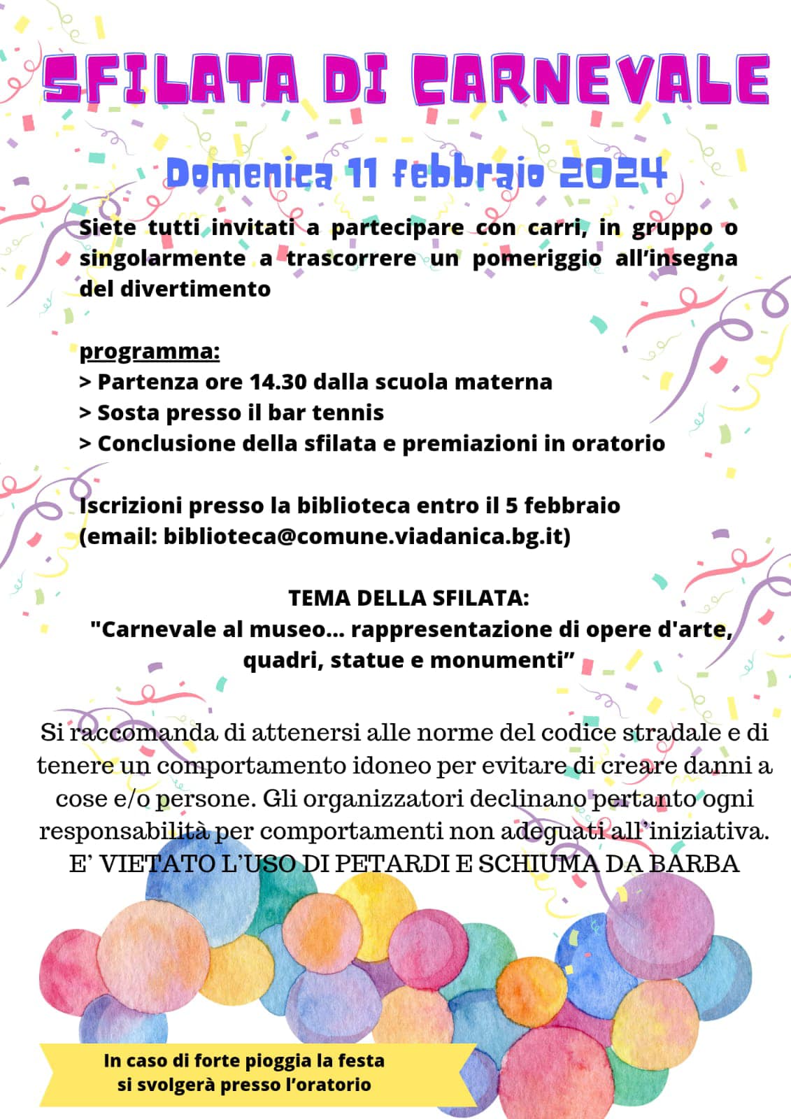 Domenica 11 febbraio, alle ore 14:30, a Viadanica si terrà la Sfilata di Carnevale con il tema “Carnevale al museo…rappresentazione di opere d’arte, quadri, statue e monumenti”.
