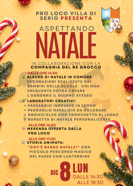 Preparati a vivere un pomeriggio incantevole a Villa di Serio lunedì 8 Dicembre, dalle 14:30 alle 18:30, con l'iniziativa "Aspettando Natale", realizzata in collaborazione con la Compagnia del Re Gnocco.