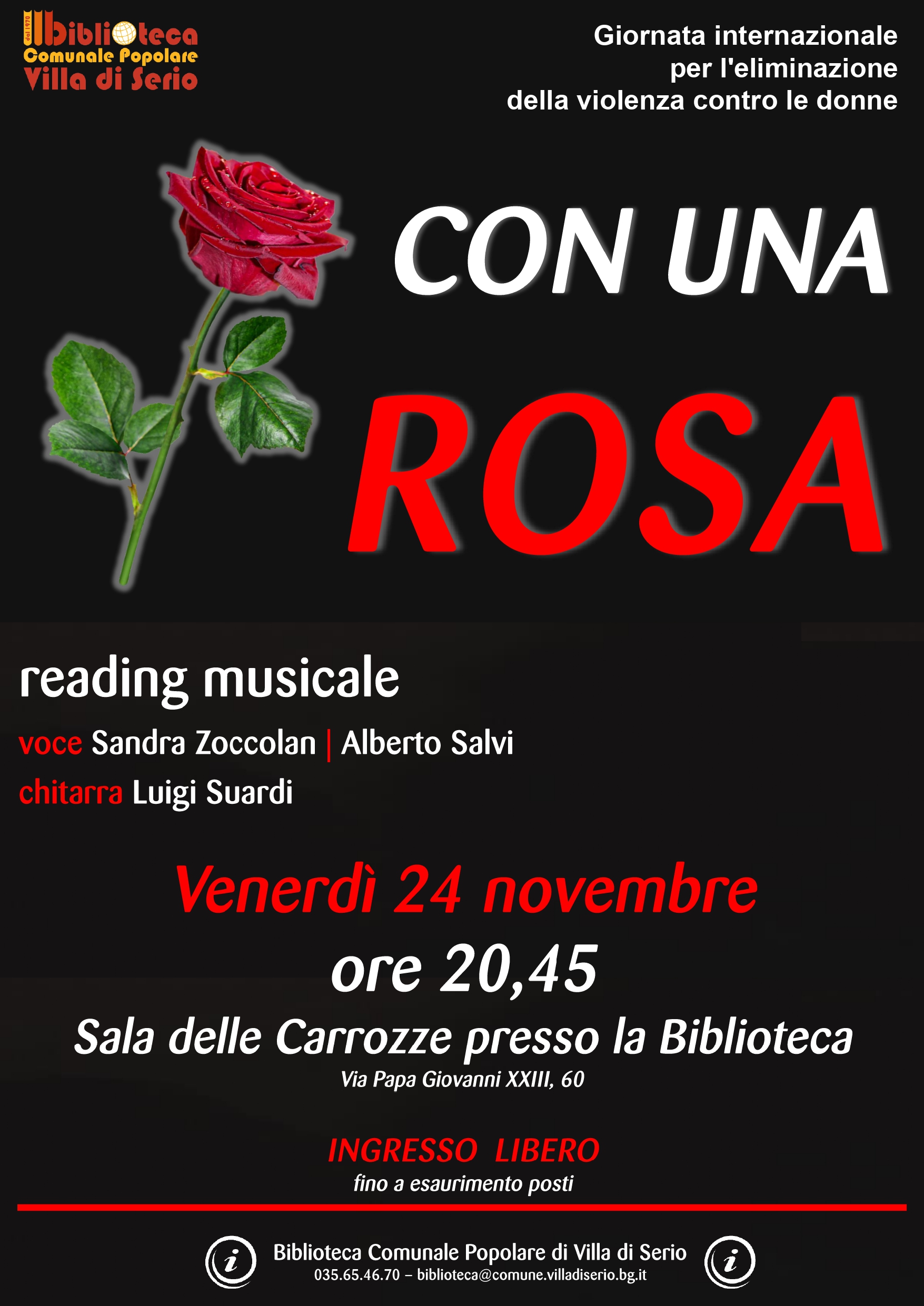 La Biblioteca di Villa di Serio, in occasione della Giornata internazionale per l'eliminazione della violenza contro le donne, organizza "Con una rosa". Reading musicale con Sandra Zoccolan e Alberto Salvi alla voce e Luigi Suardi alla chitarra. Appuntamento alle ore 20.45 presso la Sala della Carrozze della Biblioteca.