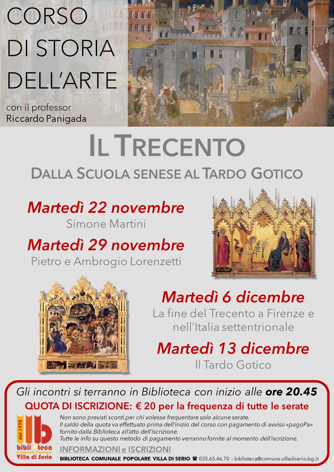 La Biblioteca comunale di Villa di Serio organizza per i mesi di novembre e dicembre quattro incontri dedicati alla storia dell'arte con il professor Riccardo Panigada, approfondendo l'argomento "Il Trecento: dalla scuola Senese al Tardo Gotico".